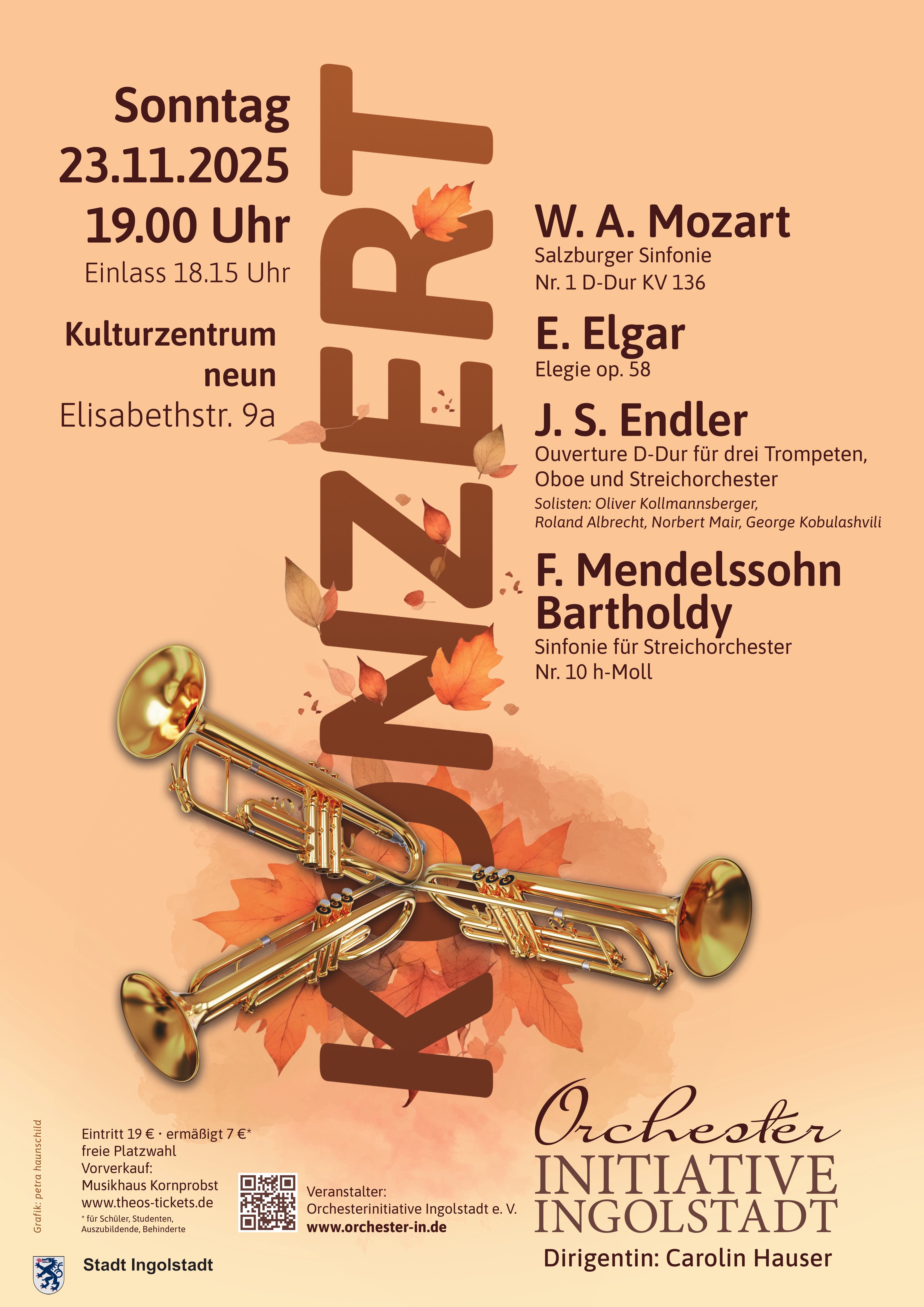 Änderungen an Veranstaltung einreichen Name der VeranstaltungBeschreibung<p><strong>Von Barockglanz bis Sturm und Drang: Herbstkonzert der Orchesterinitiative Ingolstadt</strong></p> <p>Die Orchesterinitiative Ingolstadt präsentiert am <strong>Sonntag, den 23. November 2025, um 19.00 Uhr</strong> im <strong>Kulturzentrum neun</strong> ein facettenreiches Programm.</p> <p>Unter der Leitung von Carolin Hauser spannt das Ensemble einen Bogen durch drei Jahrhunderte Musikgeschichte. Freuen Sie sich auf die prunkvolle Ouvertüre des Barockmeisters <strong>Johann Samuel Endler</strong> (u.a. mit drei Trompeten, Oboe und Pauke), kontrastiert durch die Leichtigkeit von <strong>Mozarts</strong> Salzburger Sinfonie Nr. 1 und die romantische Tiefe <strong>Edward Elgars</strong> (Serenade für Streichorchester und Elegie).</p> <p>Den fulminanten Abschluss bildet die jugendliche Sinfonie h-Moll (Nr.10) von <strong>Felix Mendelssohn Bartholdy</strong>, ein beeindruckendes Zeugnis seines frühen „Sturm und Drangs“.</p> Bild Sie können hier Dateien ablegen Erlaubte Dateitypen: NameVorschauBeschreibungAlternativtextUrheberrechtLizenzDateigrößeTypZuletzt geändertKategorie2025-10-19_10-32-08-amh_7297_02----10.59 MBBild19.10.2025, 10:32 - NameVorschauBeschreibungAlternativtextUrheberrechtLizenzDateigrößeTypZuletzt geändertKategorie2025-10-19_10-32-08-orchesterinitiative_plakat_nov_2025----2.05 MBBild20.10.2025, 11:53 - Weiteres Element hinzufügen Hochladen Datum vonDatum bis(Bitte auswählen)VeranstaltungsortVeranstalterIhre AngabenVornameNachnameE-MailKommentarCaptchaForenameHiermit akzeptiere ich die Datenschutzerklärung Eingaben absenden Abbrechen * Pflichtfeld Möchten Sie die Änderungen verwerfen?