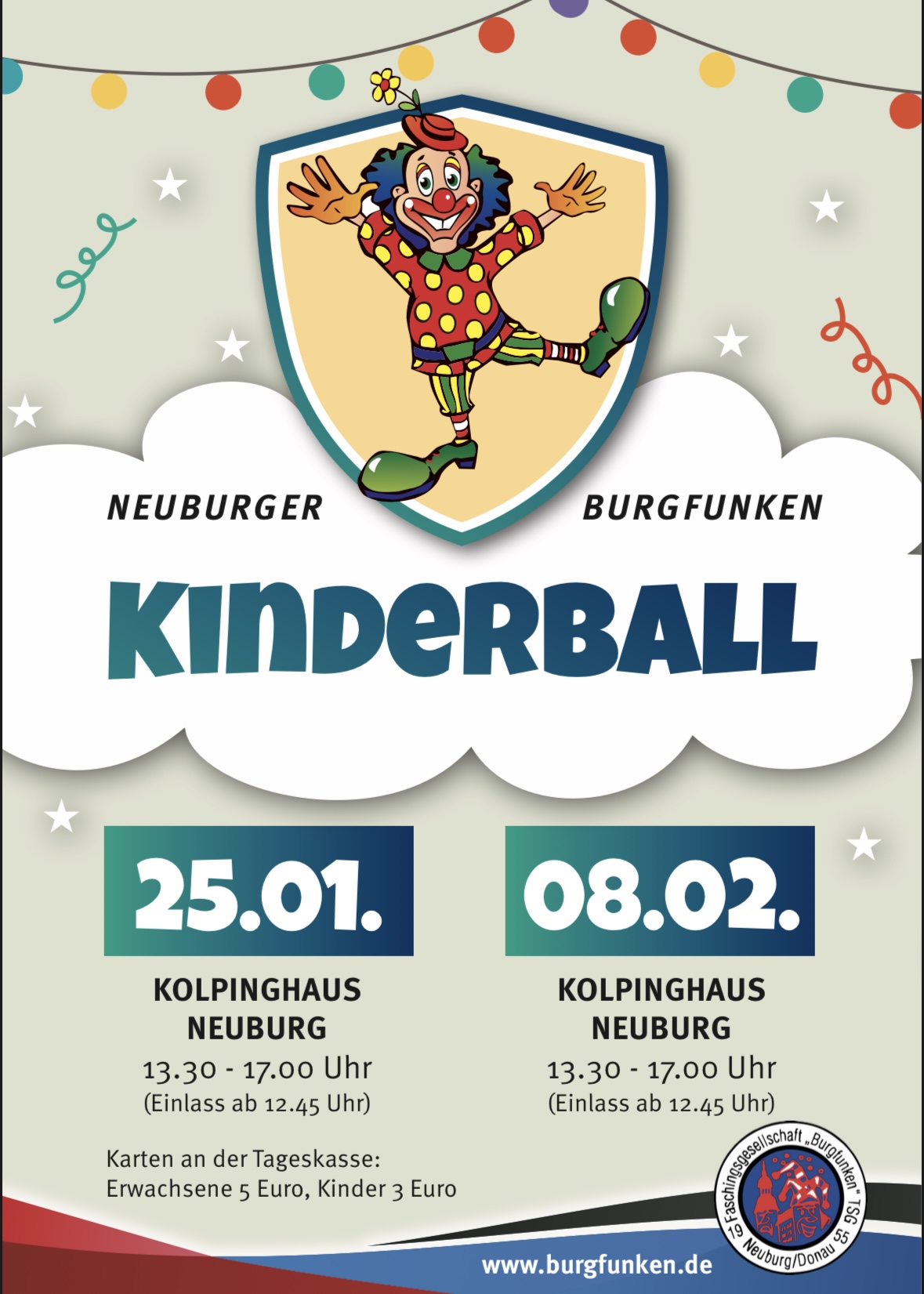 Änderungen an Veranstaltung einreichen Name der VeranstaltungBeschreibung<p>Zweiter Kinderball der Neuburger Burgfunken.</p> <p><strong>Einlass </strong>ab 12:45 Uhr</p> <p><strong>Karten an der Tageskasse</strong></p> <ul> <li>Erwachsene 5,00 €</li> <li>Kinder 3,00 €</li> </ul> Bild Sie können hier Dateien ablegen Erlaubte Dateitypen: NameVorschauBeschreibungAlternativtextUrheberrechtLizenzDateigrößeTypZuletzt geändertKategorie2025-11-14_22-15-49-img_5004----347.72 kBBild19.11.2025, 07:33 - Hinzufügen Datum vonDatum bis(Bitte auswählen)Kolpinghaus NeuburgVeranstaltungsortFaschingsgesellschaft Burgfunken Neuburg TSG weiß/blau/rot e.V.VeranstalterIhre AngabenVornameNachnameE-MailKommentarCaptchaForenameHiermit akzeptiere ich die Datenschutzerklärung Eingaben absenden Abbrechen * Pflichtfeld Möchten Sie die Änderungen verwerfen?