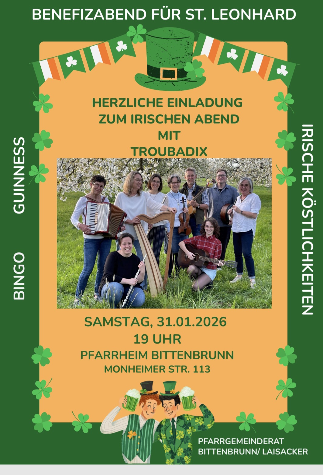 Änderungen an Veranstaltung einreichen Name der VeranstaltungBeschreibung<p>Benefizabend für St. Leonhard in Laisacker mit der Band Troubadix, irischen Köstlichkeiten, Guinness und Bingo</p> <p> </p> Bild Sie können hier Dateien ablegen Erlaubte Dateitypen: NameVorschauBeschreibungAlternativtextUrheberrechtLizenzDateigrößeTypZuletzt geändertKategorie2026-01-13_12-30-00-screenshot_20260113_122500_word----413.07 kBBild21.01.2026, 07:33 - Hinzufügen Datum vonDatum bis(Bitte auswählen)Pfarrheim Bittenbrunn, Monheimer Straße 113VeranstaltungsortPfarrgemeinderat Bittenbrunn/LaisackerVeranstalterIhre AngabenVornameNachnameE-MailKommentarCaptchaForenameHiermit akzeptiere ich die Datenschutzerklärung Eingaben absenden Abbrechen * Pflichtfeld Möchten Sie die Änderungen verwerfen?