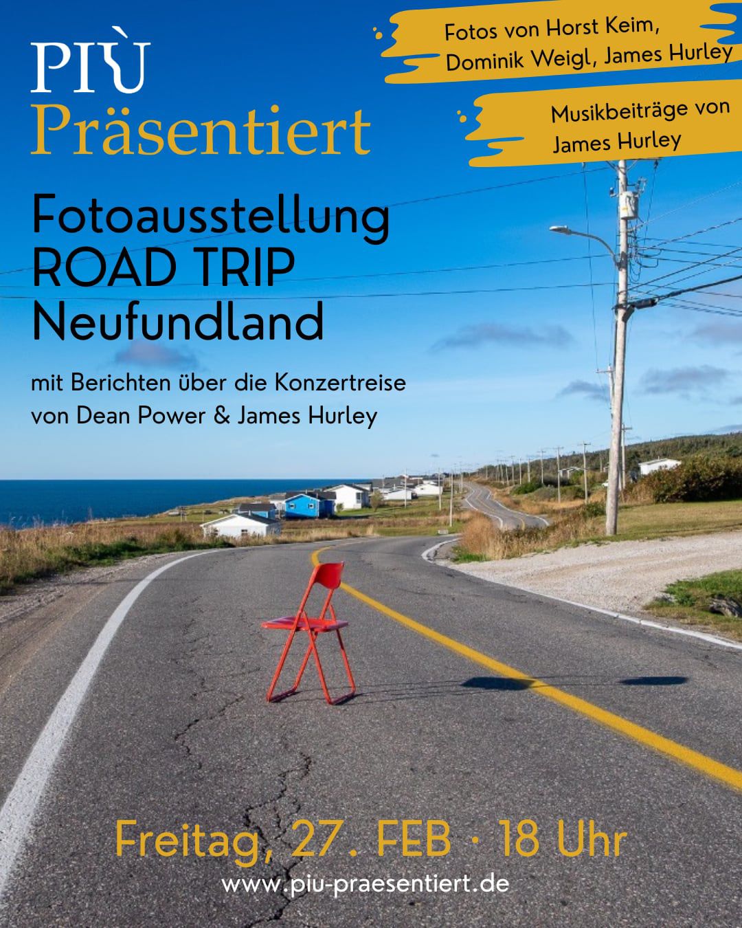 Änderungen an Veranstaltung einreichen Name der VeranstaltungBeschreibung<p style="text-align:justify">Die Ausstellung zeigt eindrucksvolle Momentaufnahmen einer besonderen Reise durch Neufundland. Gezeigt werden Fotografien von <strong>Horst Keim, Dominik Weigl und James Hurley</strong> von ihrer gemeinsamen Reise an diesen magischen Ort im Herbst 2025. Anlass dafür war die Konzerttournee von Dean Power und James. Berichte und Fotos geben Einblicke in das Leben <em>on the road</em> – zwischen Musik, Menschen und Orten. Musikalische Beiträge von James<strong> </strong>begleiten den Abend und schaffen eine atmosphärische Verbindung zwischen Bild, Klang und Geschichte.</p> <p>Eintritt frei!</p> <p>www.piu-praesentiert.de</p> Bild Sie können hier Dateien ablegen Erlaubte Dateitypen: NameVorschauBeschreibungAlternativtextUrheberrechtLizenzDateigrößeTypZuletzt geändertKategorie2026-02-05_08-39-59-644ab359-574b-498f-bac2-39dfc418c499----244.26 kBBild06.02.2026, 07:34 - Hinzufügen Datum vonDatum bis(Bitte auswählen)Più PianoVeranstaltungsortPiù Präsentiert e. V.VeranstalterIhre AngabenVornameNachnameE-MailKommentarCaptchaForenameHiermit akzeptiere ich die Datenschutzerklärung Eingaben absenden Abbrechen * Pflichtfeld Möchten Sie die Änderungen verwerfen?