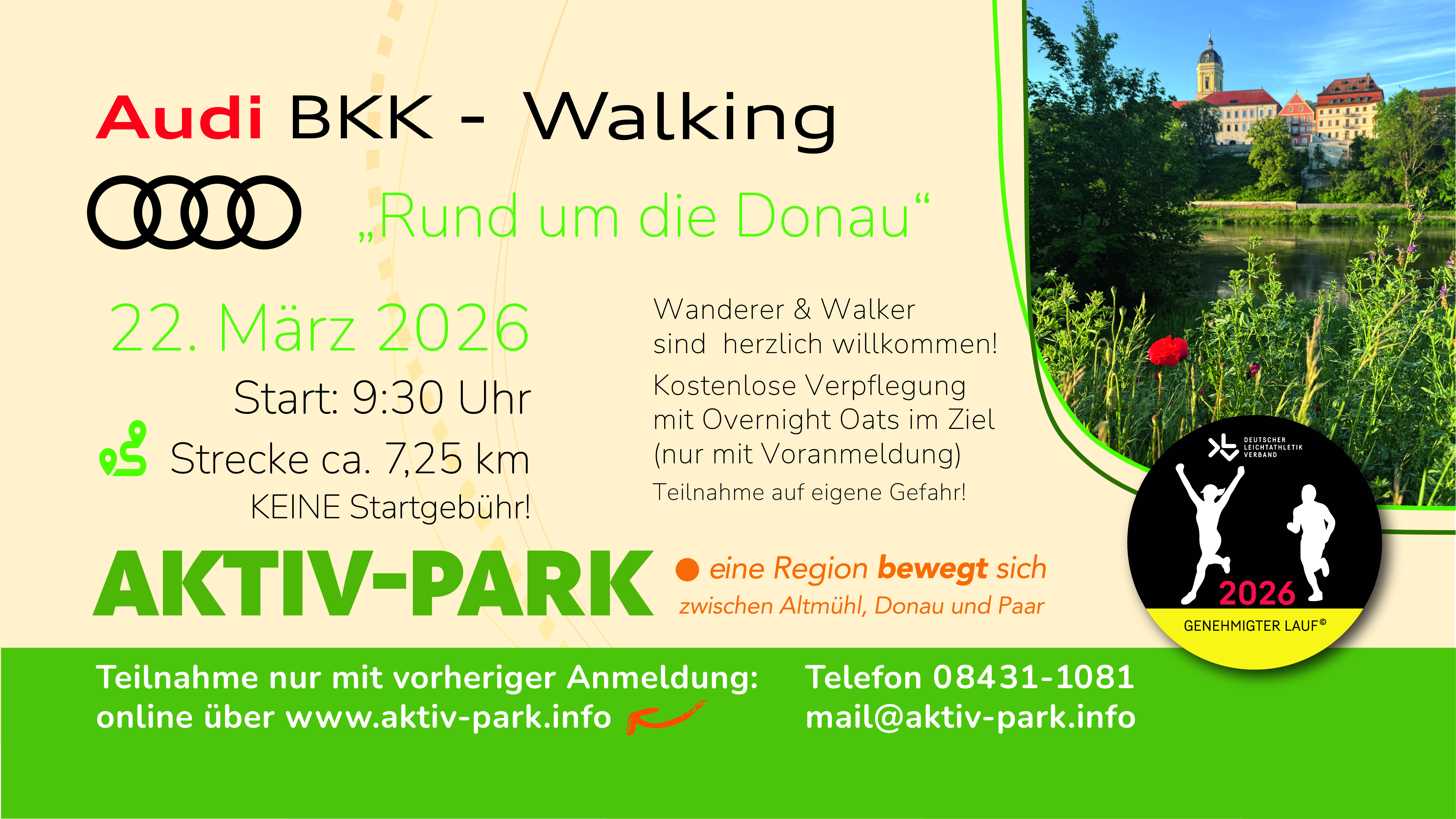 Änderungen an Veranstaltung einreichen Name der VeranstaltungBeschreibung<p style="text-align:justify"><strong>Sonntag, 22. März 2026 | Schloss Neuburg</strong></p> <p style="text-align:justify">Starte aktiv in den Sonntag und erlebe die besondere Atmosphäre rund um das Renaissance-Schloss Neuburg bei unserem gemeinsamen Walking-Event im Rahmen von „Neuburg Gesund & Aktiv“. In entspannter Runde geht es auf eine schöne Strecke durch und um Neuburg – ideal für alle, die sich gerne an der frischen Luft bewegen und den Tag bewusst beginnen möchten.</p> <p style="text-align:justify">Egal ob Walking, gemütliches Wandern oder zügiges Gehen – alle sind willkommen. Im Mittelpunkt stehen die Freude an Bewegung, das gemeinsame Erlebnis und ein gesunder Start in den Tag.</p> <p style="text-align:justify">Start & Treffpunkt</p> <p style="text-align:justify">Treffpunkt ab 9:00 Uhr im Innenhof des Renaissance-Schlosses Neuburg</p> <p style="text-align:justify">Start um 9:30 Uhr</p> <p>(Residenzstraße 2, 86633 Neuburg an der Donau)</p> <p>Parkmöglichkeiten bestehen an der Schlösslwiese (Fußweg zum Schloss ca. 7 Minuten).</p> <p> </p> <p><strong>Gut zu wissen</strong></p> <ul> <li> <p>Teilnahme kostenlos</p> </li> <li> <p>Die ersten 50 angemeldeten Teilnehmer*innen erhalten im Ziel ein kostenloses Overnight Oats (nur mit Voranmeldung)</p> </li> <li> <p>Jeder Teilnehmerin erhält eine Urkunde</p> </li> <li> <p>Im Anschluss besteht die Möglichkeit, an einer Yogastunde im Schloss Neuburg teilzunehmen (kostenpflichtig)</p> </li> <li> <p>Teilnahme nur mit vorheriger <a data-tabindex-counter="1" data-tabindex-value="none" href="https://www.aktiv-park.info/aktuell/aktuelle-veranstaltungen/audi-bkk-walking.html" tabindex="-1">Anmeldung</a></p> </li> <li> <p>Teilnahme auf eigene Gefahr</p> </li> </ul> <p> </p> <p><strong>Anmeldung</strong></p> <p><a data-tabindex-counter="1" data-tabindex-value="none" href="https://www.aktiv-park.info/aktuell/aktuelle-veranstaltungen/audi-bkk-walking.html" tabindex="-1">Online</a></p> <p>Telefonisch unter 08431 1081</p> <p>Per E-Mail an mail@aktiv-park.info</p> <p> </p> <p>Mach mit, beweg dich mit uns durch Neuburg und gönn dir danach – wenn du magst – noch eine wohltuende Yoga-Einheit im Schloss. </p> Bild Sie können hier Dateien ablegen Erlaubte Dateitypen: NameVorschauBeschreibungAlternativtextUrheberrechtLizenzDateigrößeTypZuletzt geändertKategorie2026-02-26_11-30-20-2602_veranstaltungsbild_aktivpark----8.06 MBBild27.02.2026, 07:34 - Hinzufügen Datum vonDatum bis(Bitte auswählen)Residenzschloss NeuburgVeranstaltungsortAktiv Park e.V.VeranstalterIhre AngabenVornameNachnameE-MailKommentarCaptchaForenameHiermit akzeptiere ich die Datenschutzerklärung Eingaben absenden Abbrechen * Pflichtfeld Möchten Sie die Änderungen verwerfen?