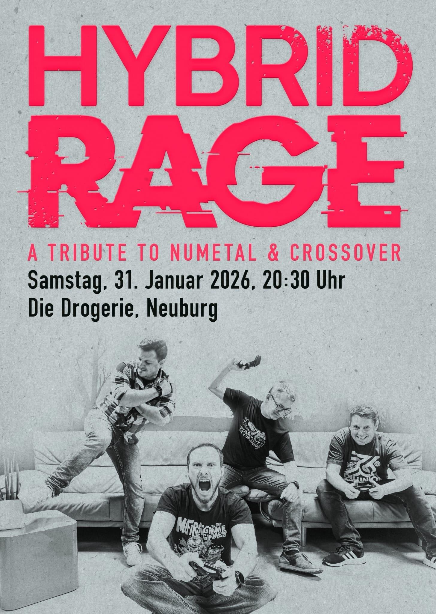 HYBRID RAGE – A Tribute To NuMetal And Crossover : Hier ist der Name buchstäblich Programm! Eine Zeitreise zurück in die Rock-Discos und auf die Festivals der 1990er bis 2000er. Von Limp Bizkit bis Papa Roach. Von Korn über die Foo Fighters bis hin zu den Guano Apes. Für jeden und jede Metaler/in ist etwas dabei. Start 20:30 Uhr