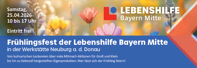 Der Frühling wird gefeiert – und zwar bei der Lebenshilfe Bayern Mitte. Beim jährlichen Frühlingsfest in der Werkstätte in Neuburg an der Donau erwarten die Besucherinnen und Besucher kulinarische Leckereien, viele Mitmach-Aktionen für Groß und Klein bis hin zu liebevoll hergestellten Eigenprodukten. Das FLORANUM, der Grünbereich der Lebenshilfe, wird ebenfalls mit einem Pflanzenverkauf mit dabei sein. Von 10 bis 17 Uhr öffnet die Werkstätte am 25. April 2026 ihre Türen und zeigt allen Interessierten, was die Lebenshilfe an ihrem Standort in der Nördlichen Grünauer Straße 38 in Neuburg zu bieten hat. Der Eintritt ist frei.