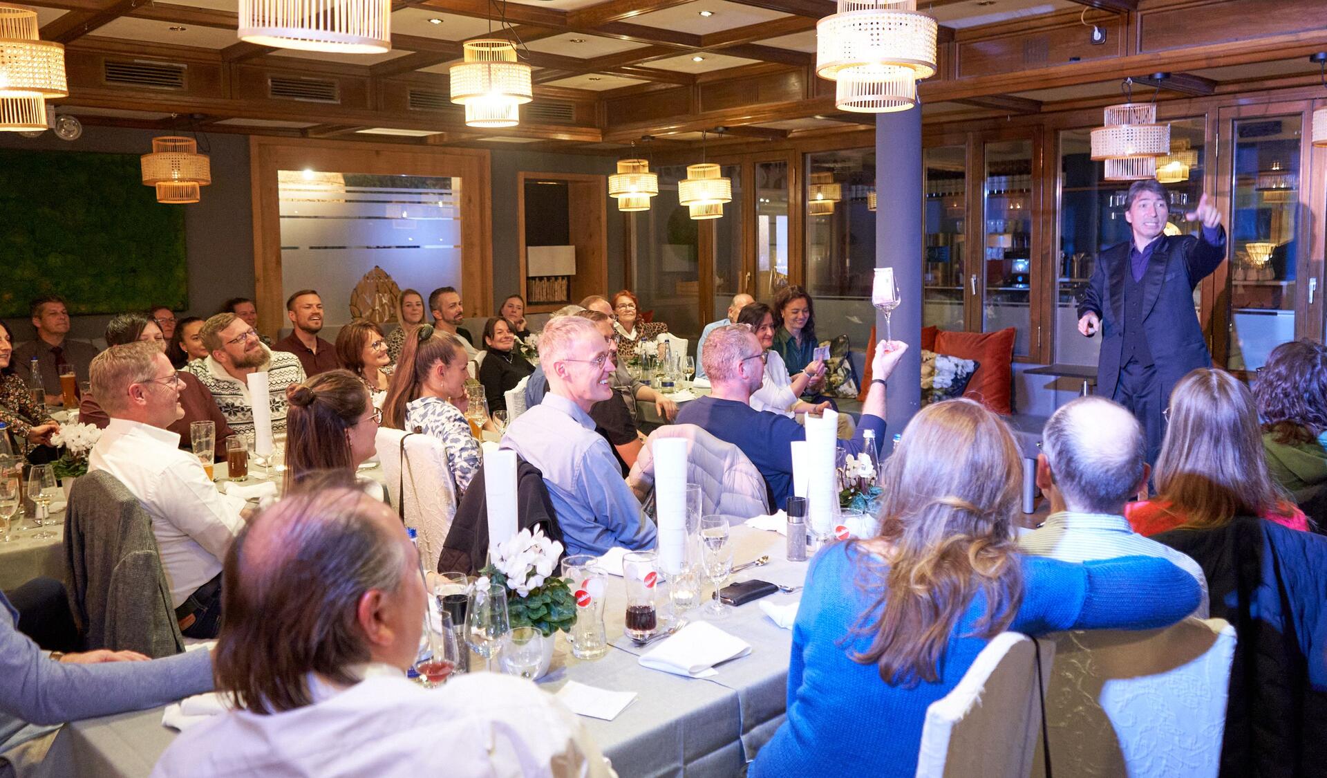 Zwischen den Menügängen treten die Zauberkünstler auf den Plan. Inmitten des Publikums zeigen sie ihre Kunst und bringen die Zuschauer zum Staunen und Lachen, so dass der Abend unvergesslich wird.